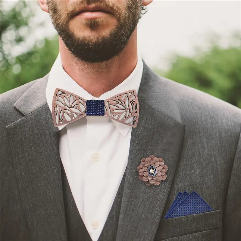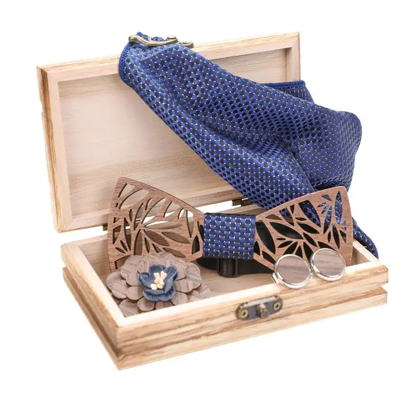 De set bevat een houten vlinderdas en bijpassende houten manchetknopen, met een verfijnde afwerking die perfect is voor formele evenementen, bruiloften of een stijlvolle zakelijke outfit. Het natuurlijke houtpatroon maakt elk stuk uniek.